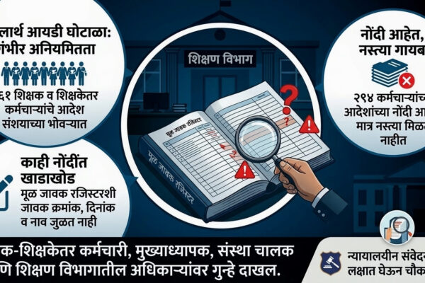जळगाव l वास्तव पोस्ट न्यूज नेटवर्क जळगाव जिल्ह्यातील शिक्षण विभागात ‘शालार्थ आयडी’ संदर्भात एक खळबळजनक प्रकार समोर आला असून, तब्बल ६६१ शिक्षक व शिक्षकेतर कर्मचाऱ्यांच्या शालार्थ आदेशांमध्ये गंभीर अनियमितता आढळून आली आहे. विशेष म्हणजे, यातील अनेक आदेशांची अधिकृत ‘जावक रजिस्टर’मध्ये नोंदच नसल्याचे निष्पन्न झाले आहे.नेमका प्रकार काय?शिक्षण विभागाच्या मूळ जावक रजिस्टरची पडताळणी केली असता, अनेक…