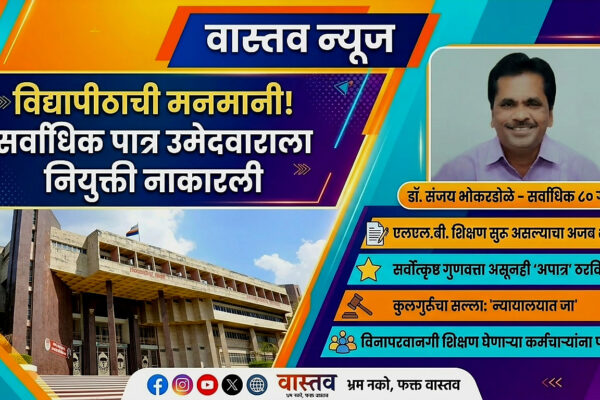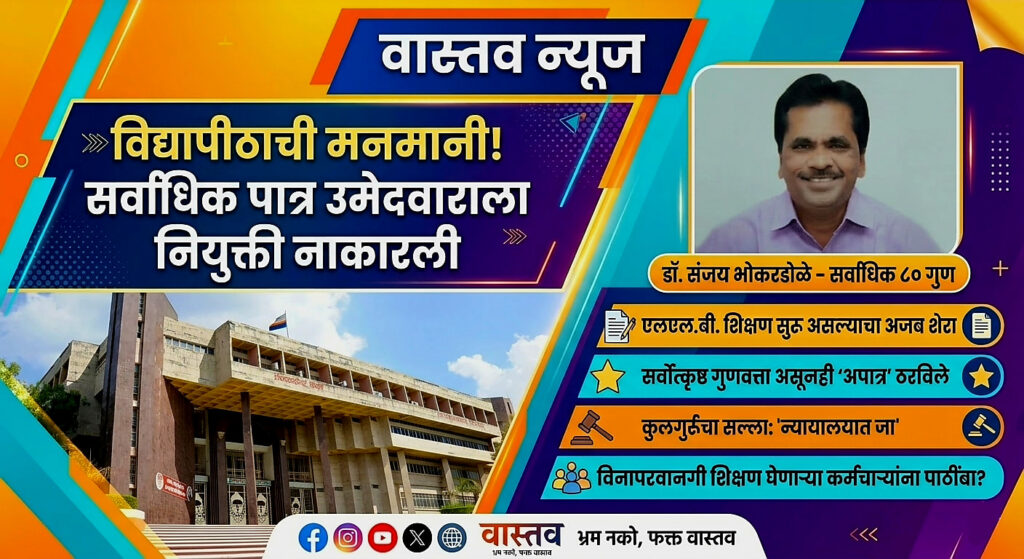 विद्यापीठाची मनमानी : बेकायदा शिक्षण घेणाऱ्या कर्मचाऱ्यांना पाठीशी घालणारे प्रशासन पात्र उमेदवारावर अन्याय का करतेय? जळगाव l वास्तव पोस्ट न्यूज नेटवर्क जळगाव : एकिकडे उच्च शिक्षणाचा प्रचार आणि प्रसार करणाऱ्या कवयित्री बहिणाबाई चौधरी उत्तर महाराष्ट्र विद्यापीठाने स्वतःच एक धक्कादायक आणि अनाकलनीय निर्णय घेतला आहे. मास कम्युनिकेशन ॲण्ड जर्नालिझम विभागात सहाय्यक प्राध्यापक पदासाठी सर्वाधिक ८० गुण…