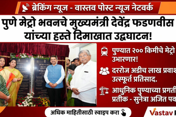 पुणे | वास्तव पोस्ट न्यूज नेटवर्क शहराच्या सार्वजनिक वाहतूक व्यवस्थेला बळकटी देणाऱ्या पुणे मेट्रो प्रकल्पाच्या प्रशासकीय मुख्यालय असलेल्या ‘मेट्रो भवन’चे उद्घाटन मुख्यमंत्री देवेंद्र फडणवीस यांच्या हस्ते संपन्न झाले. यावेळी उपमुख्यमंत्री तथा पुण्याच्या पालकमंत्री सुनेत्रा पवार, उच्च व तंत्रशिक्षण मंत्री चंद्रकांत पाटील, नगरविकास राज्यमंत्री माधुरी मिसाळ आदी मान्यवर उपस्थित होते. २०० किमीचे मेट्रो जाळे उभारणार: मुख्यमंत्री…