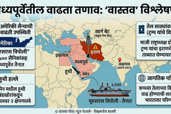 वॉशिंग्टन/तेहरान l वास्तव पोस्ट वृत्तसंस्था मध्यपूर्वेतील तणाव आता एका नव्या आणि धोकादायक वळणावर येऊन पोहोचला आहे. इराण आणि इस्रायल यांच्यातील संघर्षाची व्याप्ती वाढत असून, अमेरिकेने आपली मोठी युद्धनौका या भागात तैनात केली आहे. दरम्यान, अमेरिकेचे माजी राष्ट्राध्यक्ष डोनाल्ड ट्रम्प यांनी इराणच्या तेल साठ्यांबाबत केलेल्या विधानामुळे जागतिक राजकारणात खळबळ उडाली आहे. युद्धाच्या उंबरठ्यावर मध्यपूर्व? • अमेरिकेची…