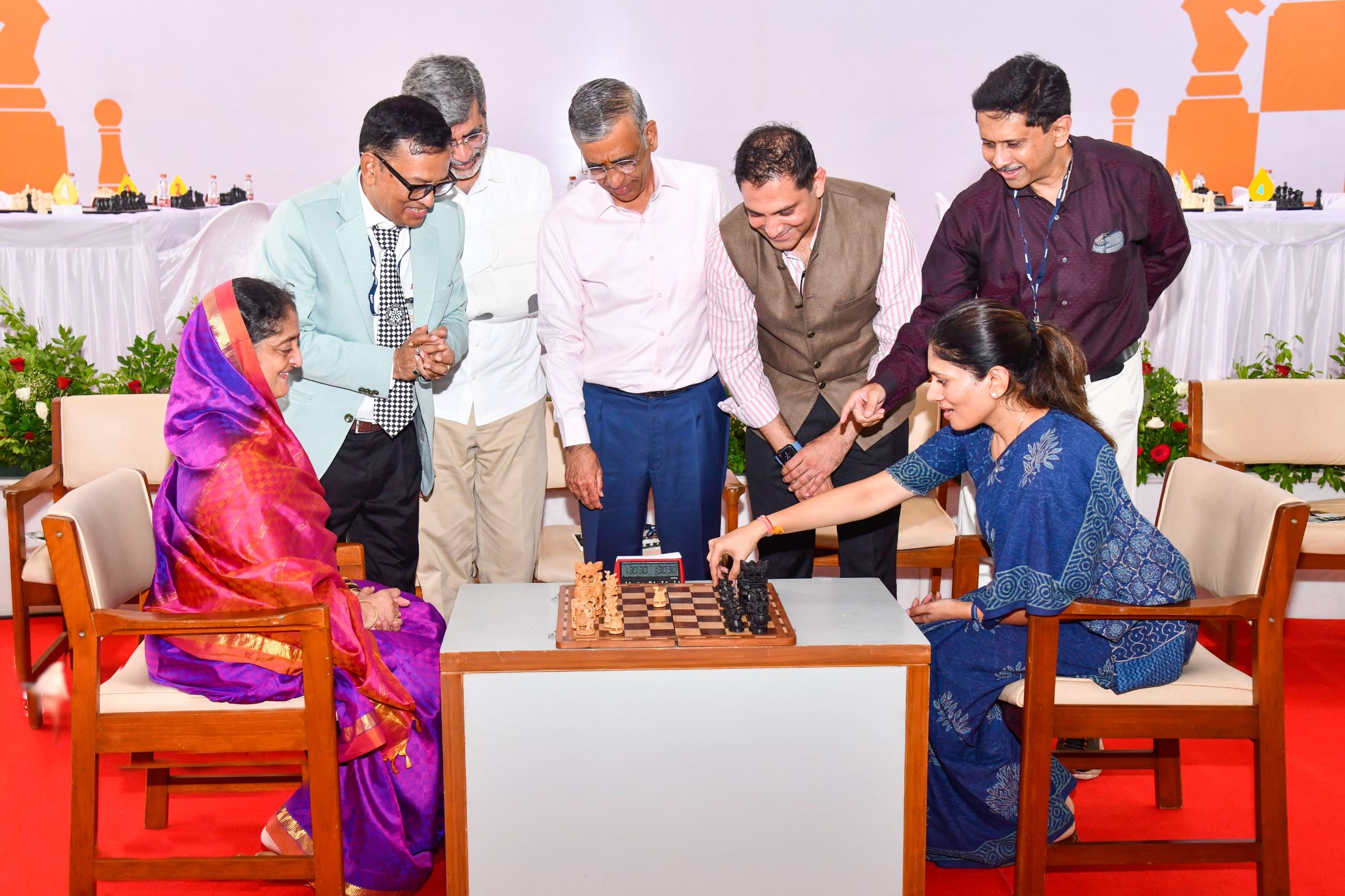 बुद्धिबळ स्पर्धेचे उद्घाटन करतान केंद्रीय युवक कल्याण व क्रीडा राज्यमंत्री रक्षा खडसे, खासदार स्मिता वाघ, पंच देवाशीस बरुआ, अतुल जैन, अशोक जैन, सिद्धार्थ मयूर, निरंजन गोडबोले