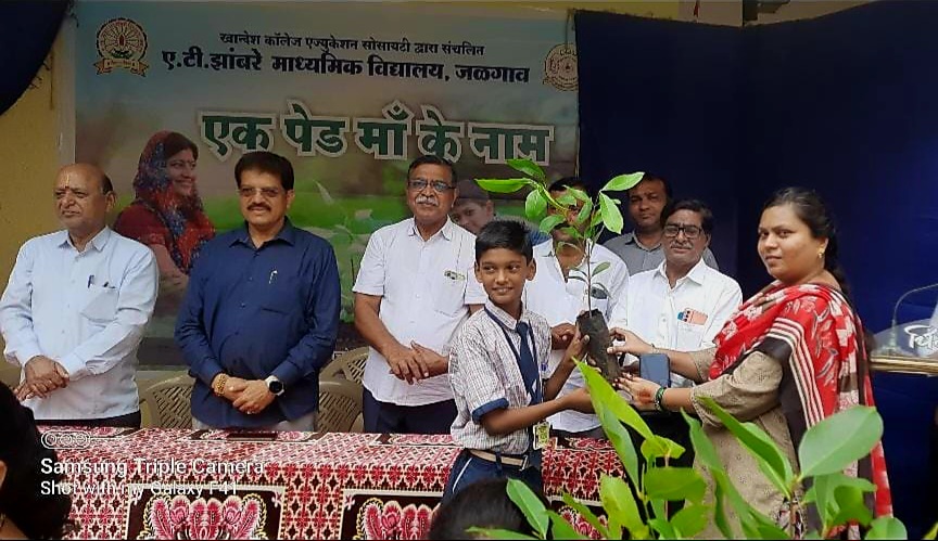 जळगाव ( वास्तव पोस्ट ) : खान्देश काॅलेज एज्युकेशन सोसायटी संचलित ए.टी. झांबरे माध्यमिक विद्यालय जळगाव येथे ‘एक पेड मा के नाम’ या कार्यक्रमाचे आयोजन करण्यात आले. सदर कार्यक्रमास प्रमुख पाहुणे म्हणून आमदार सुरेश भोळे, माजी नगरसेविका उज्ज्वला बेंडाळे, माजी नगरसेविका गायत्री राणे, माजी नगरसेविका, अजित राणे प्राचार्य अशोक राणे के.सी.ई. सांस्कृतिक कार्यक्रम समन्वयक शशिकांत वडोदकर, विद्यालयाच्या मुख्याध्यापिका प्रणिता झांबरे, पर्यवेक्षक नरेंद्र पालवे व्यासपीठावर उपस्थित होते. मान्यवरांच्या हस्ते गणपतीची आरती करण्यात आली. सदर कार्यक्रमाची सुरुवात ईशस्तवन व स्वागतगीताने करण्यात आली.