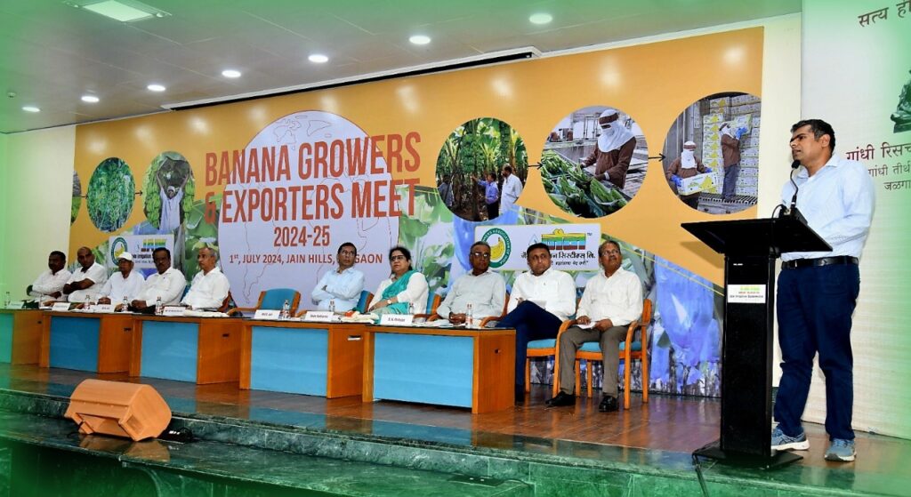 ॲग्रीकल्चर प्रोसेस फूड प्रोडक्ट्स एक्सपोर्ट डेव्हलपमेंट ॲथोरिटी (अपेडा) व जैन इरिगेशन सिस्टीम्स लि. तर्फे कस्तुरबा सभागृह येथे आयोजित ‘बनाना ग्रोवर्स ॲण्ड एक्सपोटर्स मीट २०२४-२५’ मध्ये प्रमुुख अतिथी म्हणून अभिषेक देव बोलत होते.