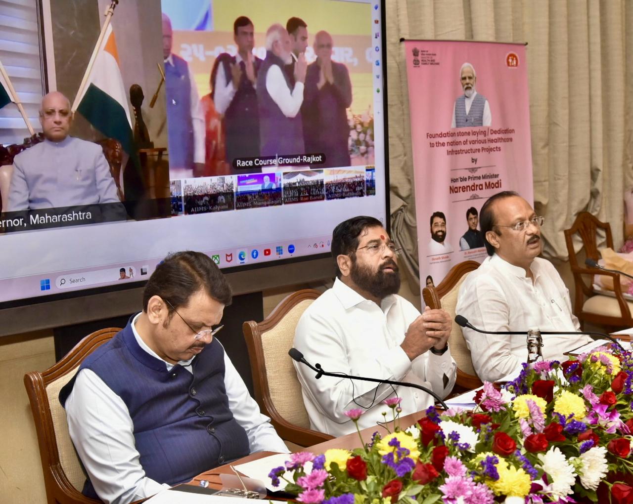 प्रधानमंत्री नरेंद्र मोदी यांच्या हस्ते राजकोट येथून दुरदृष्यप्रणालीद्वारे राज्यातील विविध आरोग्य पायाभूत सुविधा प्रकल्पांचे भूमिपूजन आणि राष्ट्राला समर्पण करण्यात आले.सह्याद्री अतिथीगृह मलबार हिल मुंबई येथे यानिमित्ताने विशेष कार्यक्रमाचे आयोजन करण्यात आले होते.यासाठी राज्यपाल रमेश बैस, मुख्यमंत्री एकनाथ शिंदे , उपमुख्यमंत्री देवेन्द्र फडणवीस, उपमुख्यमंत्री अजित पवार , उच्च शिक्षण मंत्री चंद्रकांतदादा पाटील, आरोग्य मंत्री डॉ.तानाजी सावंत, ग्रामविकास मंत्री गिरीश महाजन, महसूल मंत्री राधाकृष्ण विखे पाटील, राज्य उत्पादन शुल्क मंत्री दादा भुसे, वैद्यकीय शिक्षण मंत्री हसन मुश्रीफ, कृषी मंत्री धनंजय मुंडे, गृहनिर्माण मंत्री अतुल सावे, आदिवासी विकास मंत्री डॉ.राजेंद्र गावित , शिक्षण मंत्री दीपक केसरकर , जल व मृदुसंधारण मंत्री संजय राठोड , क्रीडा मंत्री संजय बनसोड , मुख्यमंत्री कार्यालय प्रधान सचीव, विकास खारगे, प्रधान सचिव भूषण गगराणी , प्रधान सचिव ब्रिजेश सिंह, अपर मुख्य सचिव आरोग्य सेवा मिलिंद म्हैसकर , आरोग्य सेवा सचिव नवीन सोना, संचालक आरोग्य सेवा आरोग्य अभियान नवी दिल्ली डॉ. सरोज कुमार डॉ. अतिरिक्त संचालक डॉ. स्वप्नील लाळे ,सहसंचालक डॉ.सुनिता गोलाईत अधीक्षक अभियंता देवेंद्र पवार, उपसंचालक डॉ.कैलास बाविस्कर व आरोग्य विभागातील अधिकारी ,कर्मचारी मोठ्या संख्येने उपस्थित होते.तसेच राज्यातील सर्व आरोग्य संस्था या कार्यक्रमासाठी दूर दूरदृश प्रणाली द्वारे उपस्थित होत्या.