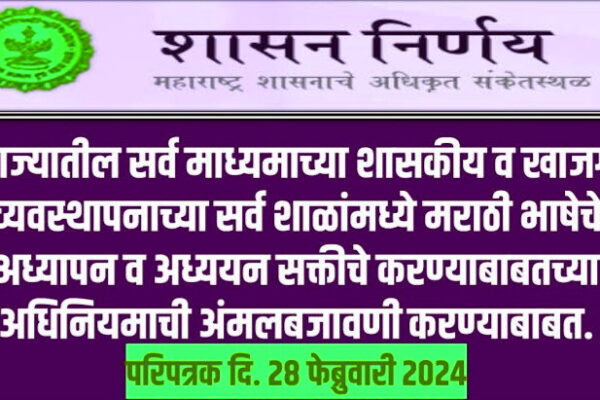 राज्यातील सर्व माध्यमाच्या व व्यवस्थापनाच्या शाळांमध्ये मराठी भाषेचे अध्यापन व अध्ययन सक्तीचे ;शासन परिपत्रक जारी
