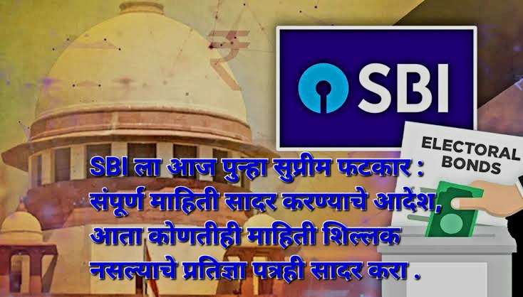 सोमवारी सर्वोच्च न्यायालयात इलेक्टोरल बाँड प्रकरणावर पुन्हा सुनावणी झाली. एसबीआय इलेक्टोरल बाँड्सशी संबंधित संपूर्ण माहिती देत नसल्याबद्दल कोर्टाने नाराजी व्यक्त केली. एकदा निर्देश दिल्यानंतर हे काम व्हायला हवे होते, असे सर्वोच्च न्यायालयाने म्हटले आहे. या संदर्भात गुरुवारी सायंकाळपर्यंत प्रतिज्ञापत्र दाखल करण्याचे निर्देश सर्वोच्च न्यायालयाने एसबीआयला दिले आहेत. न्यायालयाने एसबीआयला गुरुवारी सायंकाळी ५ वाजेपर्यंत प्रतिज्ञापत्र दाखल करण्यास सांगितले आहे. विशेष म्हणजे त्यांच्याकडे आता कोणतीही माहिती शिल्लक नाही, असे प्रतिज्ञापत्रात नमूद करावे लागेल.