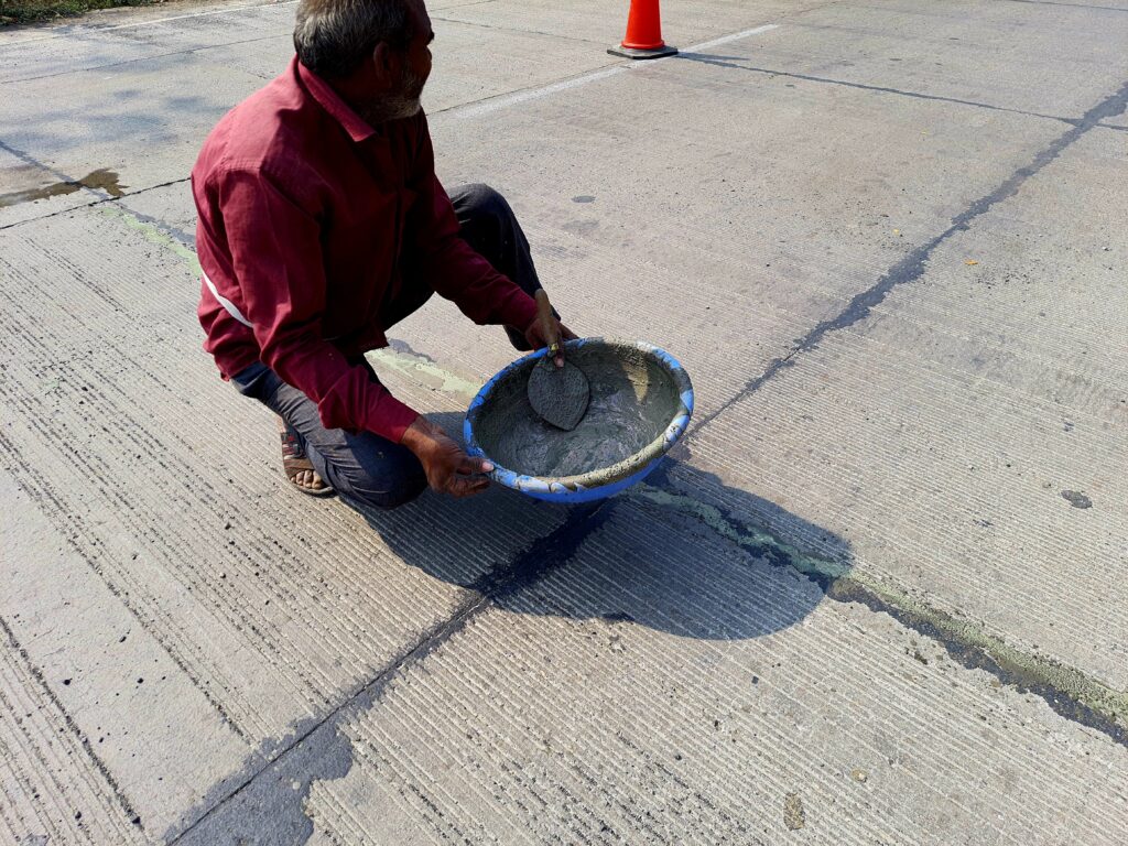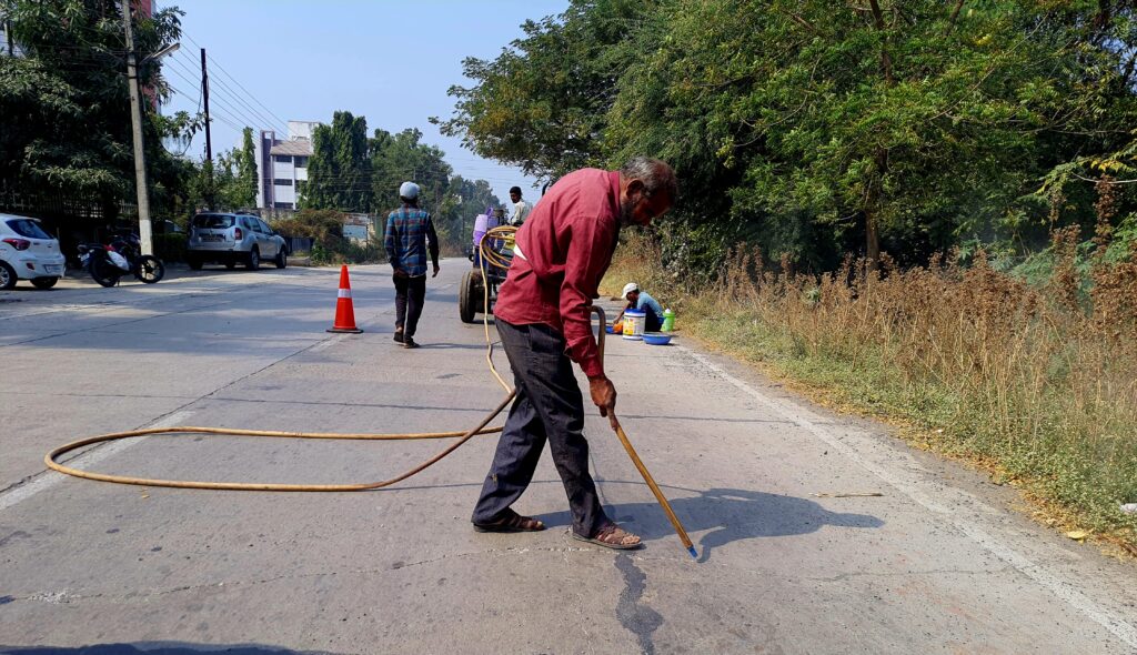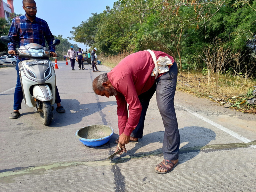 सध्या सुरु असलेल्या सुरत गेट ते निमखेडी दरम्यान काँक्रीट रस्त्याचे दुरुस्तीचे काम प्रत्यक्ष स्पॉटवर जाऊन बघितले असता या कामात बारीक रेती, त्यात सिमेंट आणि एक केमिकल टाकून केलेले मिश्रण तड्यांमध्ये टाकण्याचा प्रयत्न करतांना कामगार दिसले. प्रयत्नच म्हणावा लागेल… कारण पातळ मिश्रण केले असते तर सहज तड्यांच्या तळाशी जाऊन खालपासुनच मजबूत झाले असते. मात्र बघण्यात आलेला हा प्रकार थोडा वेगळाच दिसून आला. अशा प्रकारे वरवर मुलामा देऊन बंद केलेले तडे अजून किती दिवसांत मोकळा श्वास घ्यायला तयार होतात, ते लवकरच दिसेल.
