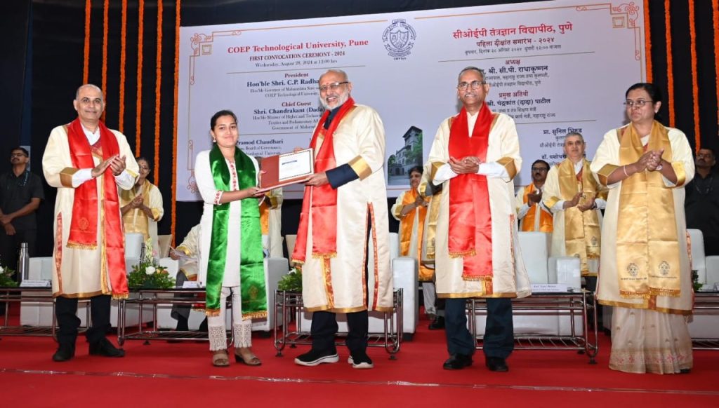 सीओईपी तंत्रज्ञान विद्यापीठाच्या पहिल्या पदवीप्रदान समारंभात राज्यपाल बोलत होते. यावेळी विद्यापीठाच्या नियामक मंडळाचे अध्यक्ष डॉ. प्रमोद चौधरी, कुलगुरू प्रा. सुनील भिरुड, कुलसचिव डॉ. दयाराम सोनवणे, परीक्षा व मूल्यमापन मंडळाच्या संचालक डॉ. यशोधरा हरिभक्त आदी उपस्थित होते.