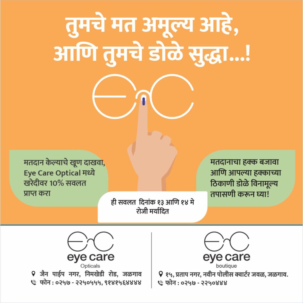 जळगाव | दि.१३ ( वास्तव पोस्ट न्यूज ) – जळगावातील निमखेडी रोड वरील कांताई नेत्रालयातर्फे मतदान करणाऱ्या नागरिकांसाठी दोन दिवस नेत्र तपासणी विनामूल्य केली जाणार आहे. जळगावातील जे मतदार मतदान केल्याची डाव्या हाताच्या बोटावरील शाईची खूण दाखवतील, त्यांना नेत्र तपासणीत शंभर टक्के सूट दिली जाणार आहे. ही सवलत दि.१३ व १४ मे या कालावधी करिता मर्यादीत आहे. मतदानाची टक्केवारी वाढावी, याकरिता कांताई नेत्रालयातर्फे ही सुविधा उपलब्ध करुन दिली आहे, या संधीचा जास्तीत जास्त जळगावकरांनी लाभ घ्यावा.