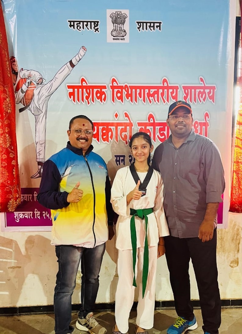 जळगाव ( वास्तव पोस्ट ) : क्रीडा व युवक सेवा संचालनालय महाराष्ट्र राज्य पुणे, जिल्हा क्रीडा कार्यालय नाशिक आणि जिल्हा क्रीडा परिषद यांच्या संयुक्त विद्यमाने सिन्नर येथे नाशिक विभागस्तरीय शालेय तायक्वांडो स्पर्धा आयोजित करण्यात आल्या होत्या. यामध्ये अनुभूती निवासी स्कूलची इयत्ता ८ वीची विद्यार्थीनी साची पाटील हिने १४ वर्ष वयोगटा खालील मुलींच्या ३२ ते ३५ वजनगटात भाग घेतला. यामध्ये तीन फेरांमध्ये प्रतिस्पर्धकांनी साची पाटील हिने एकतर्फे मात दिली. जळगाव मनपा ३२-१०, नाशिक मनपा २६-२०, नाशिक ग्रामीण २४-२० ह्यांच्यावर तिने विजय मिळविला. या विजयामुळे तिला सुवर्ण पदकाने सन्मानित करण्यात आले. तिची निवड पुणे बालेवाडी येथे दि.२८ ते ३१ ऑक्टोबर ला होणाऱ्या राज्यस्तरीय शालेय स्पर्धेसाठी निवड झाली आहे. तिला प्रशिक्षक जयेश बाविस्कर (एनआयएस) यांनी मार्गदर्शन केले.