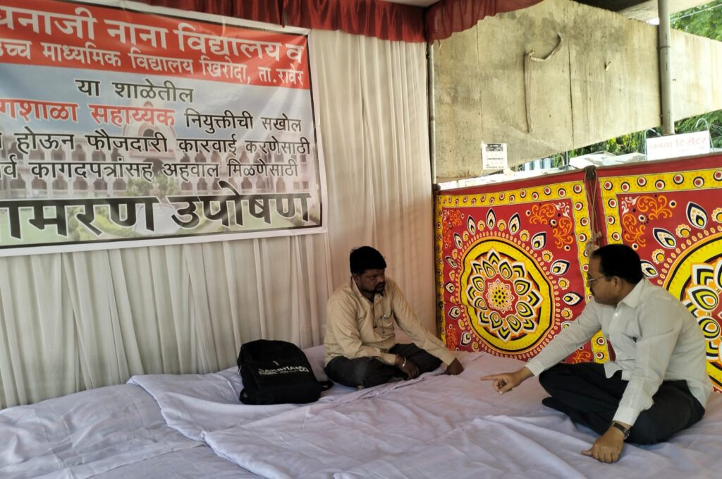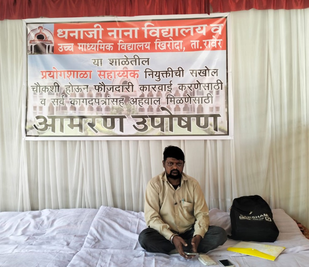 सदर शाळेतील बॅक डेटेड ने नियुक्ती केल्याची बाब उघडकीस येऊन अडचण निर्माण होऊ नये म्हणून त्याचा राजीनामा घेऊन पुन्हा नोकरी देण्यात आल्याचे सदर तक्रारदाराचे म्हणने असुन या प्रकरणाबाबत काही मुद्दे उपस्थित करून त्या अनुशंगाने सखोल चौकशी करावी व संबंधितांवर फौजदारी स्वरुपाचा गुन्हा दाखल करावा, अशी मागणी तक्रारदार प्रशांत तायडे यांनी केली होती. मात्र शिक्षण विभाग (माध्यमिक) सदर तक्रारीची कोणतीही दखल घेतली नाही. म्हणून फौजदारी गुन्हा दाखल होत नाही तोपर्यंत प्रशांत तायडे हे शिक्षणाधिकारी (माध्यामिक) यांच्या कार्यालयासमोर आमरण उपोषणास बसले आहेत.