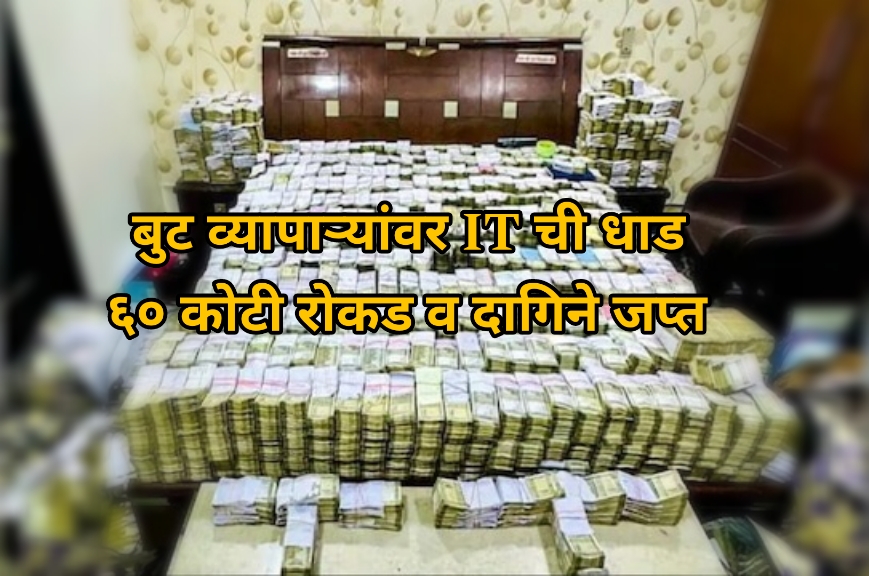 या छापेमारीत सुमारे ६० कोटी रुपयांची रोकड जप्त करण्यात आली आहे. आयकर विभागाला या व्यापाऱ्यांकडे करचोरी आणि बेहिशोबी मालमत्ता असल्याचा संशय होता. त्यामुळे त्यांनी हा छापा मारला. आयकर विभागाच्या टीमने आग्रामधील एमजी रोडवरील बीके शूज, धाकरनमधील मंशु फूटवेअर आणि हेंग की मंडीमधील हरमिलाप ट्रेडर्स आणि जयपूर हाऊसमधील निवासस्थानातील बेहिशोबी मालमत्ता प्रकरणातील कागदपत्रांची झडती घेतली. प्राप्तिकर सूत्रांनी दिलेल्या माहितीनुसार, आतापर्यंत सुमारे ६० कोटी रुपये रोख, सोने-चांदीचे दागिने तसेच जमिनीतील गुंतवणुकीची कोट्यवधी रूपयांचे कागदपत्रे जप्त केले आहेत.बुट व्यापारी हरमिलाप ट्रेडर्सचे मालक आणि व्यापारी रामनाथ डांग यांच्या घरातून ४० कोटींहून अधिक रुपयांची रोकड जप्त करण्यात आली आहे.