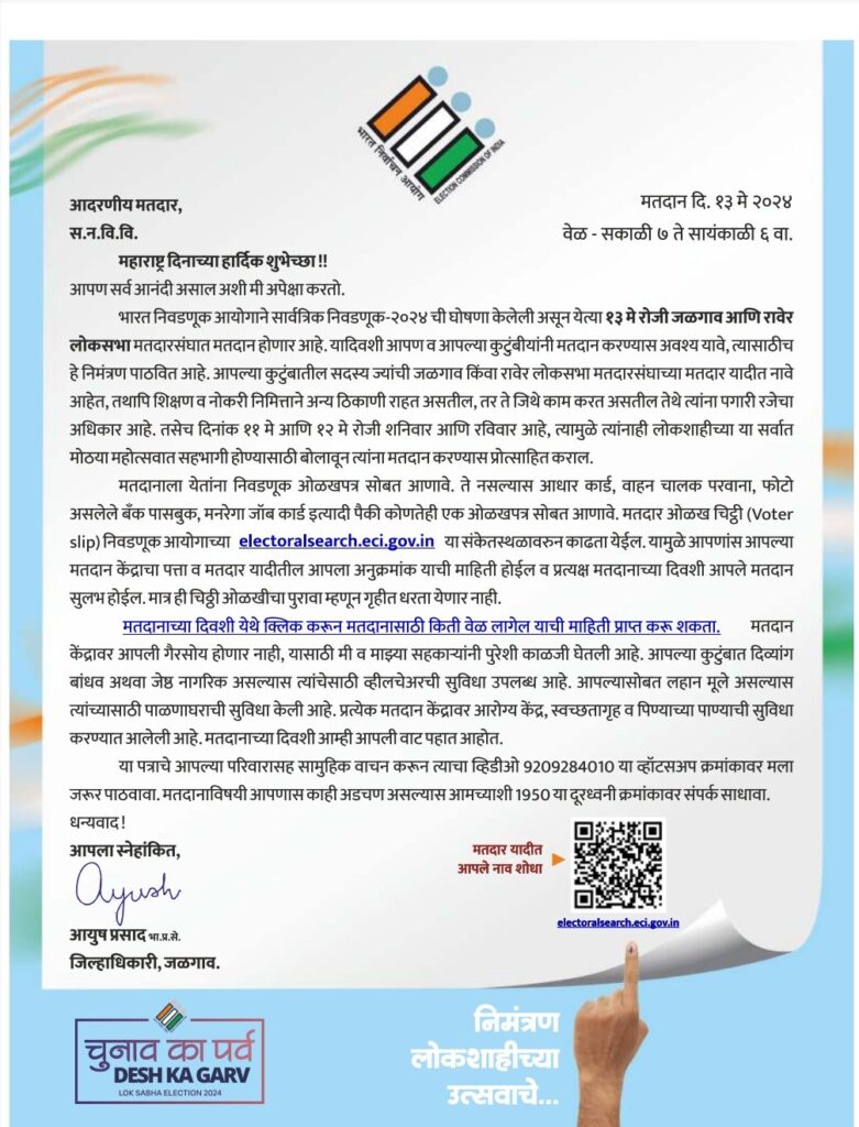 बीएलओ गिरीश भावसार यांनी जिल्हाधिकारी आयुष प्रसाद यांचे मतदानाविषयी लोकशाहीच्या या सर्वात मोठ्या महोत्सवात सहभागी होण्याच्या निमंत्रण पत्रकातील संदेशाचे वाचन केले.