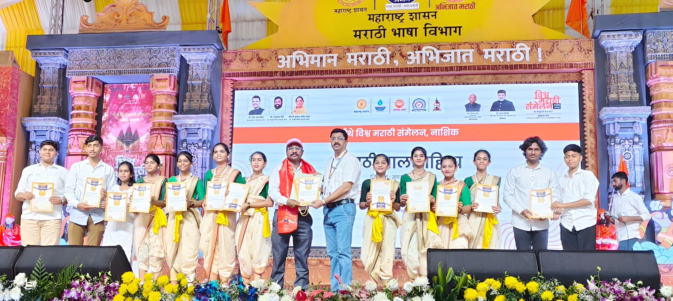 वास्तव पोस्ट l जळगाव : महाराष्ट्र शासनाच्या मराठी भाषा विभागातर्फे नाशिक येथे आयोजित चौथ्या विश्व मराठी संमेलनात जळगावच्या शिरपेचात मानाचा तुरा रोवला गेला आहे. या जागतिक स्तरावरील व्यासपीठावर जळगाव येथील अनुभूती इंग्लिश मीडियम स्कूलच्या विद्यार्थिनींनी आपल्या बहारदार ‘कातकरी नृत्याने’ उपस्थितांची मने जिंकत जळगावचा झेंडा दिमाखात फडकवला.
