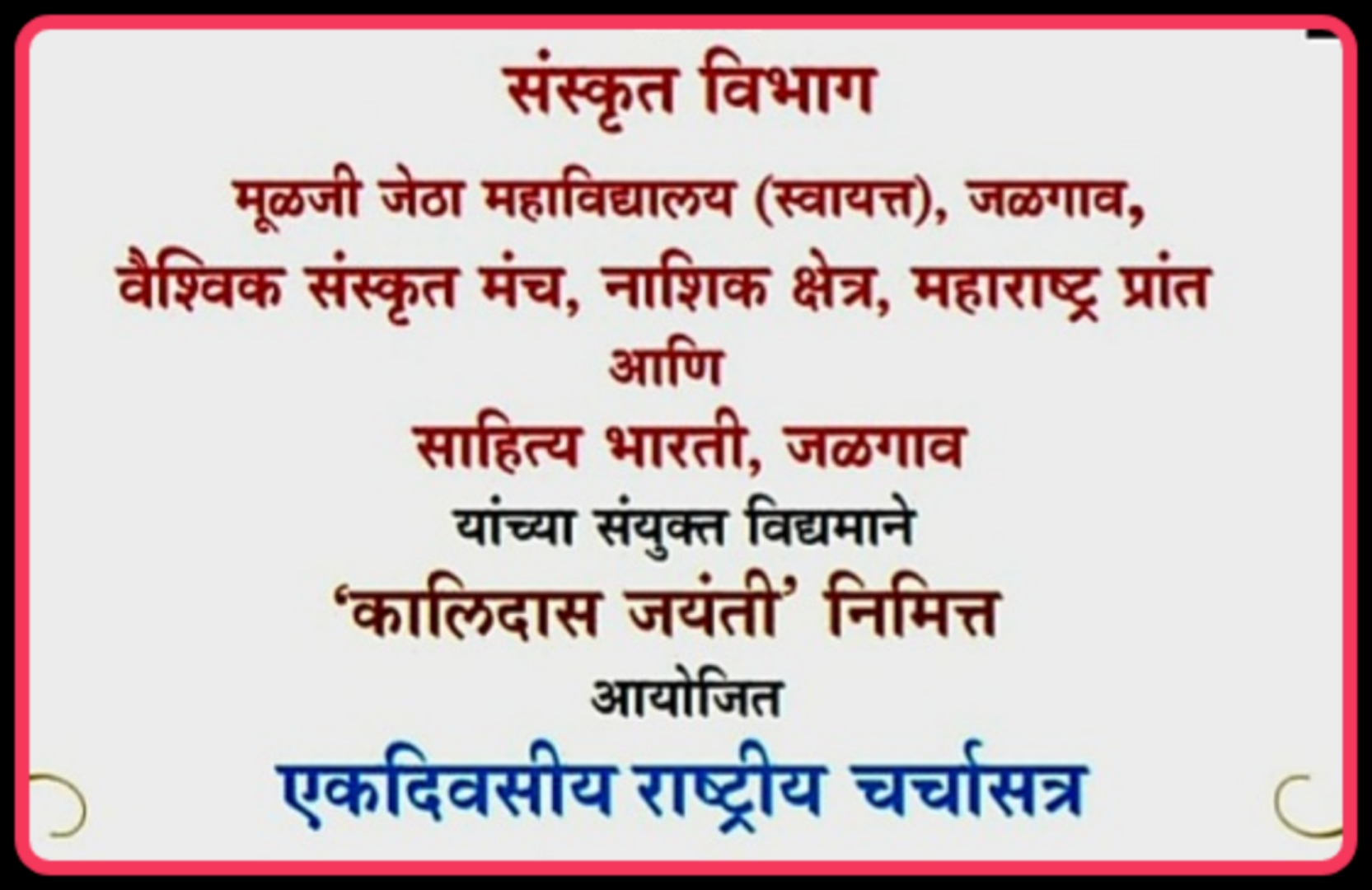 जळगाव ( वास्तव पोस्ट ) : मू.जे. महाविद्यालयाच्या संस्कृत विभाग, साहित्य भारती, जळगाव व वैश्विक संस्कृत मंच नाशिक क्षेत्र यांच्या वतीने कालिदास जयंतीचे औचित्य साधून एक दिवसीय राष्ट्रीय संगोष्ठीचे आयोजन तसेच कालिदासाच्या साहित्यवर विशेष व्याख्यानाचे आयोजन मू.जे.च्या नवीन कान्फ्रेस हॉल या ठिकाणी दि.२४ मंगळवार रोजी सकाळी १०:०० वाजता करण्यात आले आहे.