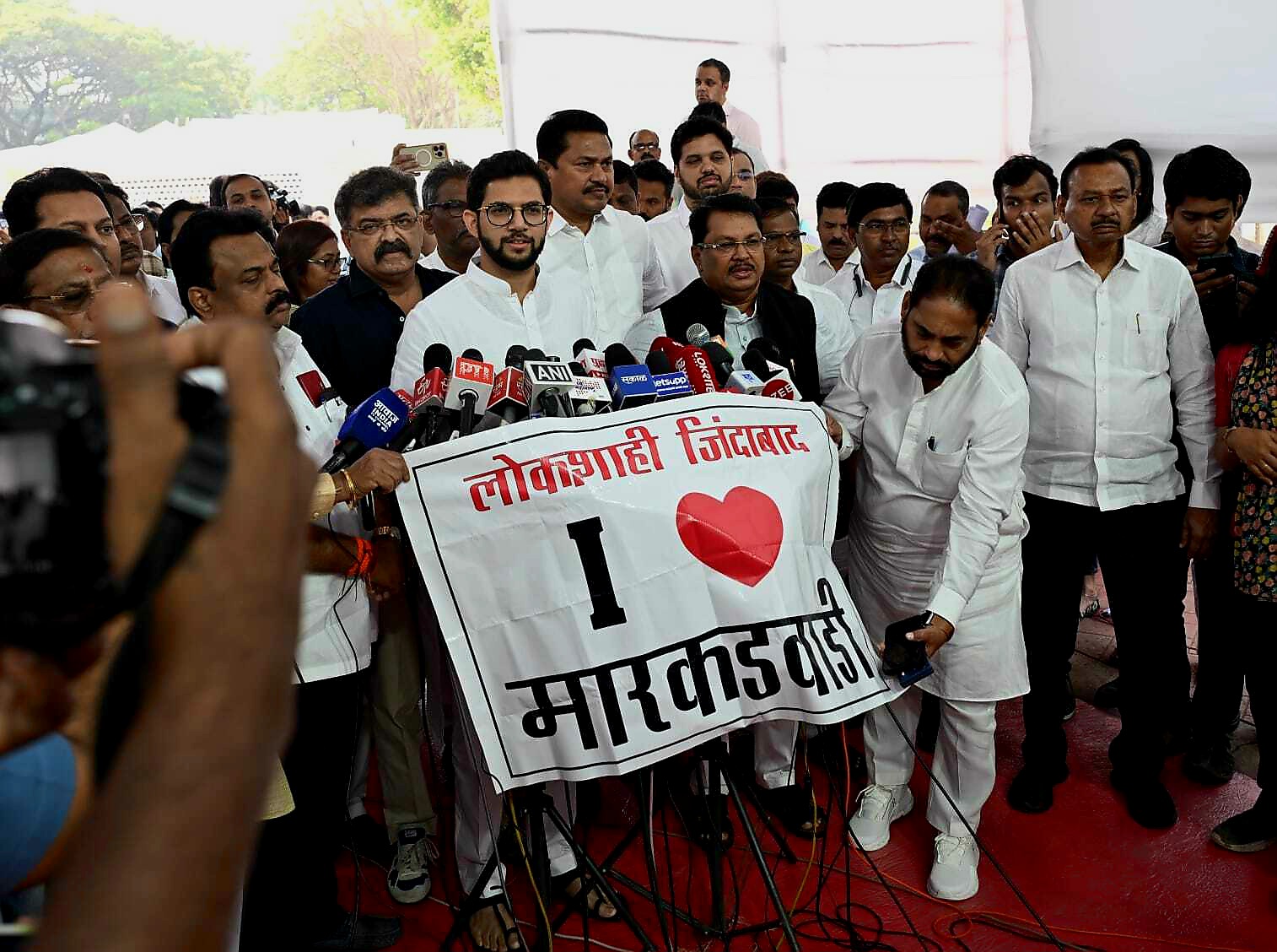 शिवसेनेचे प्रमुख नेते आदित्य ठाकरे यांनी विधान भवन संकुलात पत्रकारांशी बोलताना सांगितले की, “आम्ही आज सभागृहाचे सदस्य म्हणून शपथ न घेण्याचा निर्णय घेतला आहे. एवढ्या मोठ्या बहुमताने सरकार सत्तेवर आले की जल्लोष होतो. पण हा आदेश जनतेचा आहे की ईव्हीएम आणि निवडणूक आयोगाचा आहे, असा प्रश्न पडतो. यावेळी ठाकरे म्हणाले, निवडणूक आयोगाच्या भूमिकेवर आम्ही गंभीर प्रश्न उपस्थित केले आहेत. “ईव्हीएमबाबत लोकांच्या शंका लक्षात घेऊन आम्ही शपथ न घेण्याचा निर्णय घेतला.” ग्रामस्थांच्या आंदोलनाबाबत सरकारच्या जाचक कारवाईला विरोधकही विरोध करणार असल्याचे ते म्हणाले.