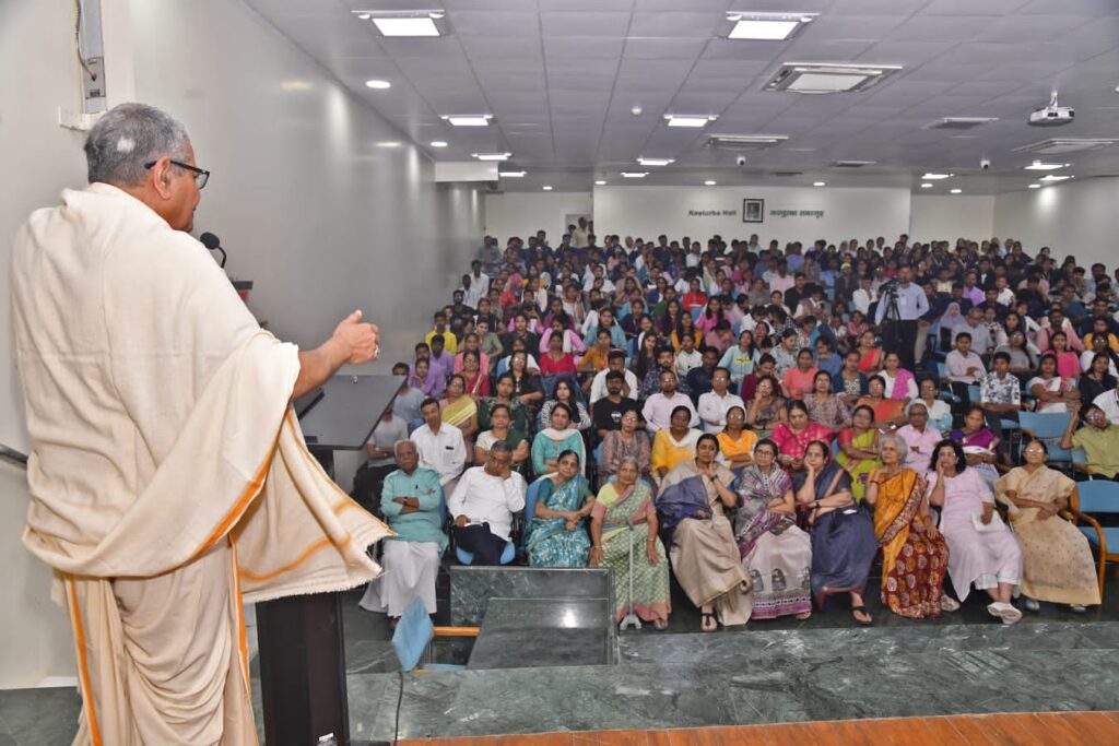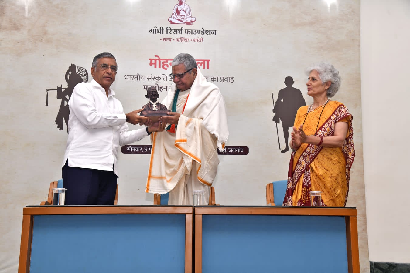समाजसेवा आणि सिद्धांतनिष्ठ कर्मयोगाची प्रेरणा भगवान श्रीकृष्ण यांनी भगवत गीतेतून दिली. याच भगवत गीतेला आपल्या कृतीतून आचरणात आणणारे महात्मा गांधी, श्रीकृष्णाने सांगितलेल्या कर्मयोगातून गांधीजींचे तत्त्वज्ञान, यावर गांधी रिसर्च फाऊंडेशनद्वारा ‘मोहन लीला’ कार्यक्रमाचे आयोजन गांधी तीर्थ कस्तूरबा सभागृह केले होते. यामध्ये वृंदावनच्या राधारमण मंदिराचे उपासक आचार्य श्रीवत्स गोस्वामी यांनी मार्गदर्शन केले. ‘मनमोहन’ ते ‘मोहनदास’ पर्यंतचा प्रवास त्यांनी सहज सोप्या भाषेत उलगडून दाखविला. यावेळी व्यासपीठावर गांधी रिसर्च फाऊंडेशनचे संचालक व जैन इरिगेशनचे अध्यक्ष अशोक जैन, फाऊंडेशनच्या रिसर्च डीन गीता धरमपाल उपस्थित होते. श्रीवत्स गोस्वामी यांचे स्वागत सूतीहार, महात्मा गांधीजींचा पुतळा, शाल देऊन अशोक जैन यांनी केले.