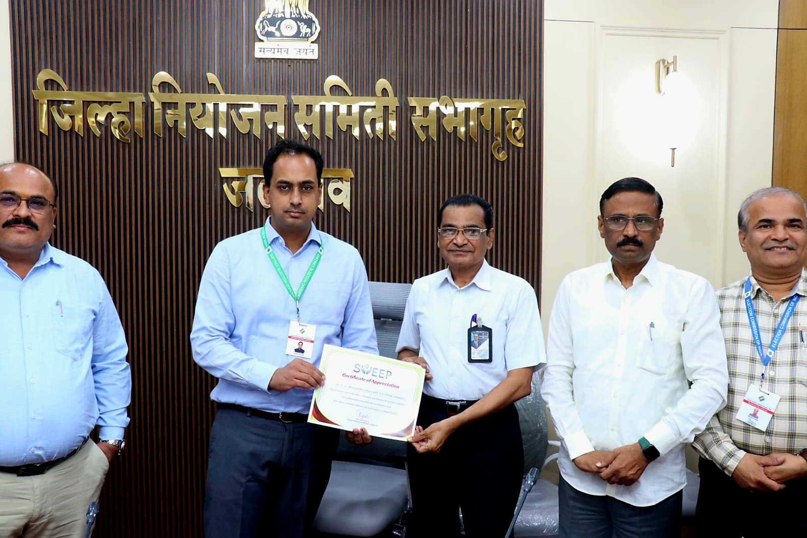 जळगाव ( वास्तव पोस्ट ) : महाराष्ट्र विधानसभा सार्वत्रिक निवडणुका २०२४ अंतर्गत जळगाव जिल्ह्यात SVEEP उपक्रमांतर्गत माननीय जिल्हाधिकारी आयुष प्रसाद यांच्या हस्ते जिल्हा नियोजन सभागृह , जिल्हाधिकारी कार्यालय, जळगाव येथे प्राचार्य संजय भारंबे याना सन्मानित करण्यात आले.