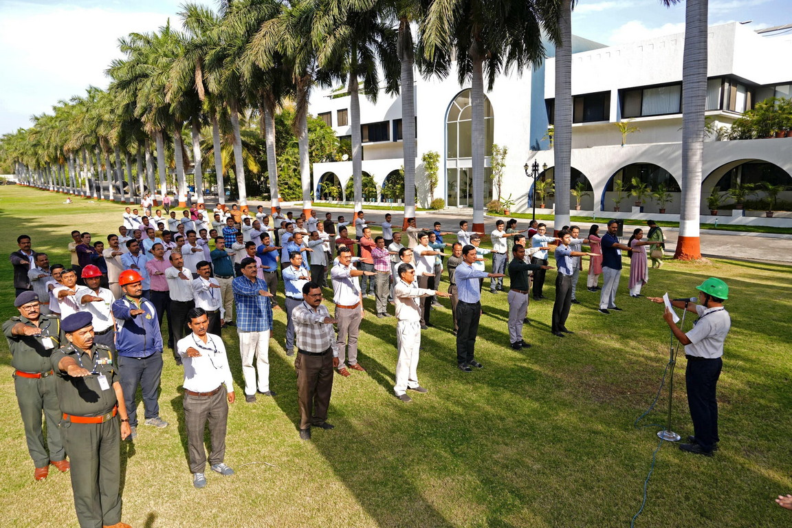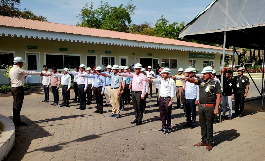 प्लास्टीक पार्क येथील प्रशासकीय इमारतीच्या समोरच्या लॉनवर सुरक्षा विभागाचे योगेश बाफना यांच्याकडून सहकाऱ्यांना सुरक्षा विषयीच्या नियमांचे काटेकोर पालन करण्याची शपथ देण्यात आली. तसेच प्लांट आवारातील सहकाऱ्यांनी सुरक्षेविषयी शपथ घेतली.