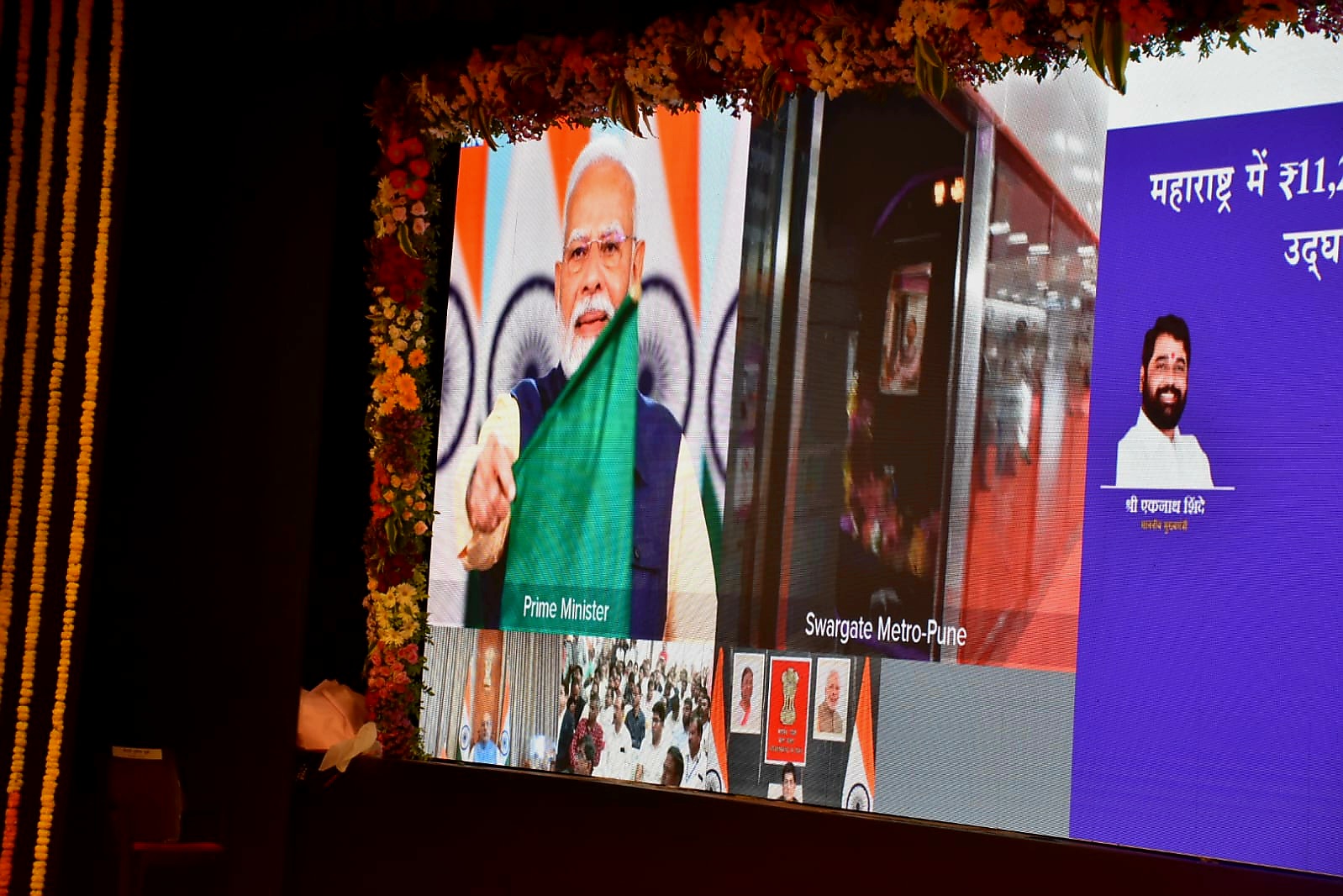 पुणे ( वास्तव पोस्ट ) : पंतप्रधान नरेंद्र मोदी यांच्या हस्ते ऑनलाईन प्रणालीद्वारे पुणे मेट्रोच्या टप्पा१ अंतर्गत जिल्हा न्यायालय ते स्वारगेट मेट्रो स्थानक मार्गावरील प्रवासी सेवेचा हिरवी झेंडी दाखवून शुभारंभ तर टप्पा १ चा दक्षिणी विस्तार स्वारगेट ते कात्रज मार्गिकेचे भूमिपूजन करण्यात आले. तसेच त्यांच्या हस्ते भिडेवाडा येथील क्रांतिज्योती सावित्रीबाई फुले यांची पहिली मुलींची शाळा स्मारकाचे भूमिपूजन, सोलापूर विमानतळाचे उद्घाटन, बिडकीन औद्योगिक क्षेत्र राष्ट्राला अर्पण करण्यात आले. या अनुषंगाने स्वारगेट येथील गणेश कला क्रीडा मंच येथे कार्यक्रम आयोजित करण्यात आला.