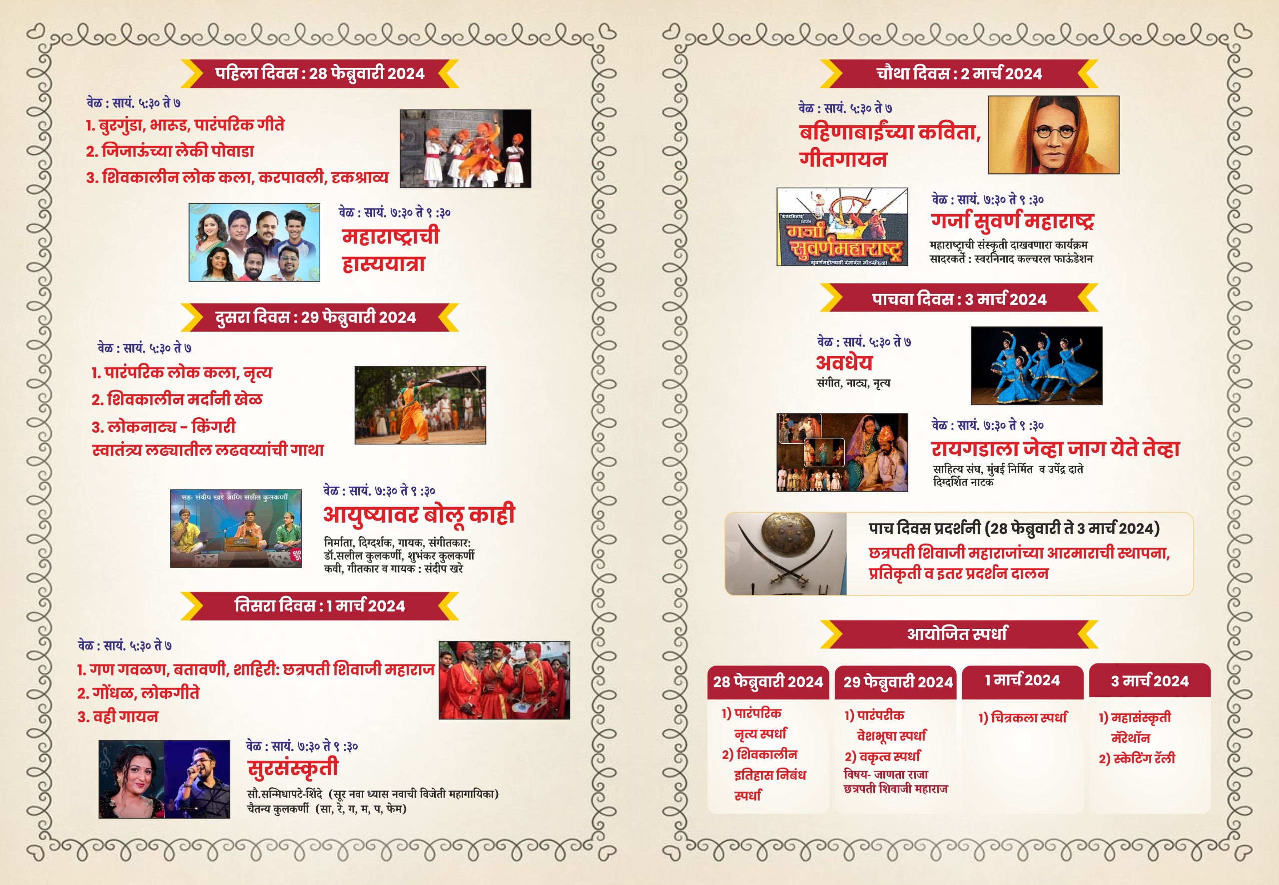 या महासंस्कृती महोत्सवात पाचही दिवशी वेगवेगळे रंगारंग कार्यक्रम असतील. त्यात बुरगुंडा, भारुड, पारंपरिक गीते, जिजाऊँच्या लेकी पोवाडा, शिवकालीन लोककला, करपावली, दृकश्राव्य तसेच महाराष्ट्राची हास्यजत्रा, पारंपारिक लोकनृत्य, शिवकालीन मर्दानी खेळ, नाटक, गणगवळन, पोवाडा, गोंधळ, बहिणाबाईंच्या काविता वाचन, चित्रकला, वेशभूषा, वकृत्व स्पर्धा इ. अशा अनेक प्रकारच्या कार्यक्रमाची पर्वणी असणार आहे. तरी जिल्हावासीयांनी मोठ्या संख्येने उपस्थित राहून कार्यक्रमाचा आंनद घ्यावा असे आवाहन जिल्हा प्रशासनाकड़ून करण्यात आले आहे .