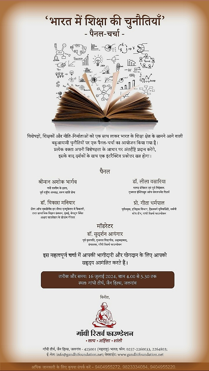 भारतातील शिक्षण क्षेत्रासमोर आगामी काळात येणाऱ्या संभाव्य आव्हानांसोबतच त्यावरील उपाय योजनांबाबत चर्चासत्रात खुली चर्चा करण्यात येणार आहे. मंगळवार, दि.१६ जुलै २०२४ रोजी संध्याकाळी ४ ते ५.३० वेळात गांधीतीर्थ, जैन हिल्स येथे आयोजित या चर्चासत्रात शिक्षण तज्ज्ञ, शिक्षक तसेच शिक्षणशास्त्र महाविद्यालयाचे विद्यार्थी यांनी मोठ्या संख्येने उपस्थित रहावे असे आवाहन गांधी रिसर्च फाऊंडेशनच्यावतीने एका प्रसिद्धीपत्रकाद्वारे करण्यात आले आहे. या चर्चासत्रात मान्यवरांसह उपस्थितांनाही चर्चेत सहभागी करून घेण्यात येणार असून त्यांचे शंका समाधान करण्यात येणार आहे.