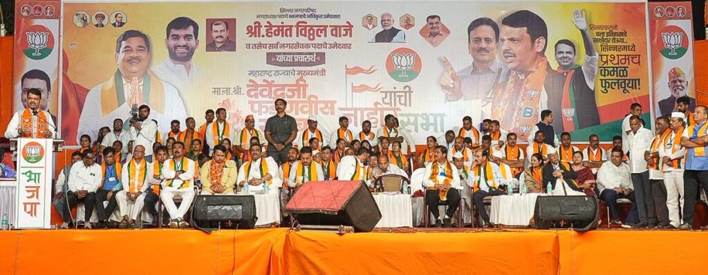 सिन्नर ( वास्तव पोस्ट ) : आज दि. १ डिसेंबर रोजी सिन्नर नगर परिषदेच्या नगराध्यक्ष पदाचे भाजपा उमेदवार हेमंत वाजे व सर्व नगरसेवक पदाचे उमेदवार यांच्या प्रचारार्थ जाहीर सभेस मुख्यमंत्री फडणवीस उपस्थित राहून त्यांनी उपस्थित जनसमुदायाला संबोधन केले.