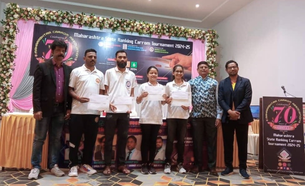पुरुष व महिला एकेरीतील विजयी व उपविजयी खेळाडूंसह महाराष्ट्र कॅरम असो. चे सर्वश्री अजित सावंत, यतिन ठाकूर आणि केतन चिखले