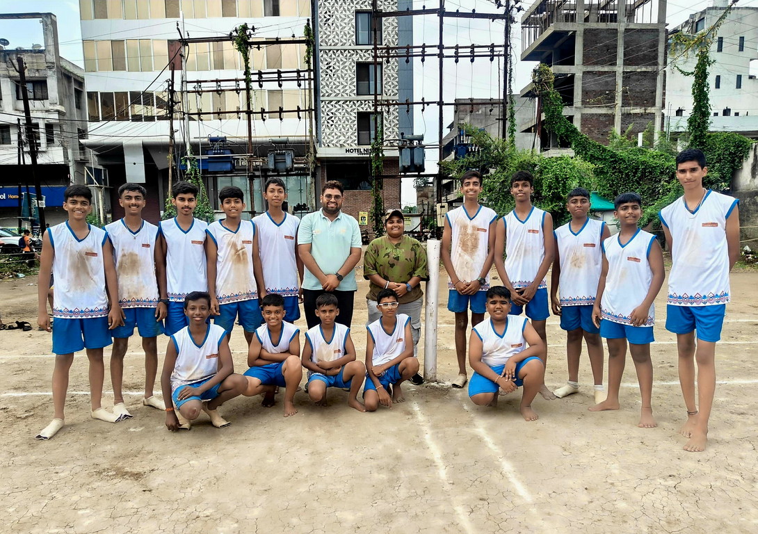 खो-खो मध्ये मनपास्तरावर विजय प्राप्त केलेल्या खेळाडूंसोबत प्रशिक्षक श्वेता कोळी, आकाश धनगर