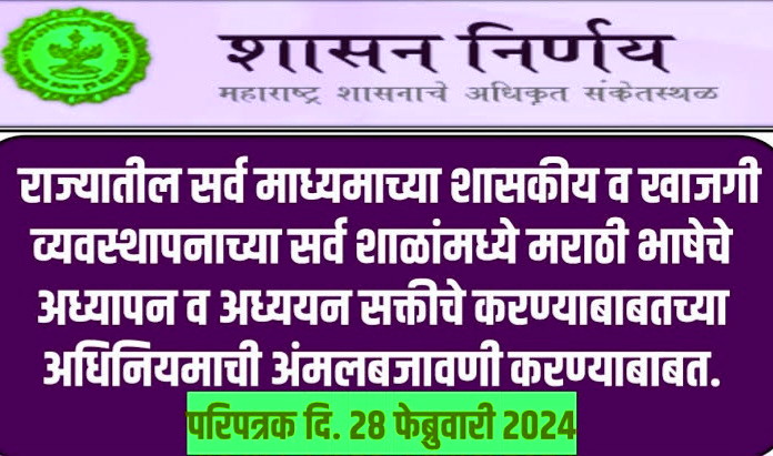मुंबई | दि.२८ ( वास्तव पोस्ट न्यूज )– राज्यातील सर्व माध्यमांच्या शासकीय व खाजगी व्यवस्थापनाच्या शाळांमध्ये मराठी भाषेचे अध्यापन व अध्ययन सक्तीचे आहे. तथापि, मराठी भाषा पुरेशा गांभीर्याने शिकविली जात नसल्याचे काही ठिकाणी दिसून येते. यामुळे राज्यातील सर्व माध्यमाच्या शासकीय व खाजगी व्यवस्थापनाच्या सर्व शाळांमध्ये मराठी भाषेचे अध्यापन व अध्ययन सक्तीचे करण्याबाबतच्या अधिनियमाची अंमलबजावणी करण्याबाबतचे निर्देश सर्व विभागीय शिक्षण उपसंचालक यांना देण्याबाबतची बाब शासनाच्या विचाराधीन होती. या अनुशंगाने महाराष्ट्र शासन शालेय शिक्षण व क्रीडा विभागाने एक शासन परिपत्रक काढून त्यात राज्यातील सर्व माध्यमांच्या सर्व व्यवस्थापनाच्या शाळांमध्ये मराठी भाषेचे अध्यापन व अध्ययन सक्तीचे करण्याबाबतच्या अधिनियमाची अंमलबजावणी करण्याचे निर्देश देण्यात आले आहे. सदर शासन परिपत्रक महाराष्ट्र शासनाच्या www.maharashtra.gov.in या संकेतस्थळावर उपलब्ध करण्यात आले असून, त्याचा संकेतांक २०२४०२२८१६२५३१७८२१ असा आहे. अधिनियमाची काटेकोरपणे अंमलबजावणी करण्याबाबतची दक्षता सर्व विभागीय शिक्षण उपसंचालक यांनी घ्यावयाची आहे.
