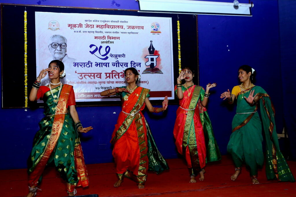 समीक्षा महिरे, शुभम चव्हाण, प्रसन्ना कुलकर्णी यांनी गणेश वंदना सादर केली. तुज मागतो मी आता, माझे माहेर पंढरी, विंचू चावला, शिवाजी महाराजांच्या कीर्तीचा पोवाडा, उठा राष्ट्रवीर हो, अरे खोप्यामधी खोपा, ही मायभूमी, माझे नमन माय मराठीला या गीतांचे क्रमाने अनुजा मंजुळ, रविशंकर ठाकरे, प्रतीक्षात दुट्टे, रविशंकर ठाकरे, वैष्णवी पाटील, आकांक्षा कोळी, राजश्री मनोहर, पूजा ओझा, सोनाली पाटील, वर्षा जाधव, दिव्या पाटील यांनी केले. दिव्या पाटील हिने केशीबास यांनी रचलेला हत्तीचा दृष्टांत म्हटला. स्नेहल सोनवणे हिने ती फुलराणी या नाटकांचा नाट्य अंश सादर केला. शीतल पाटील या विद्यार्थिनीने अहिराणी नाट्य सादर केले.