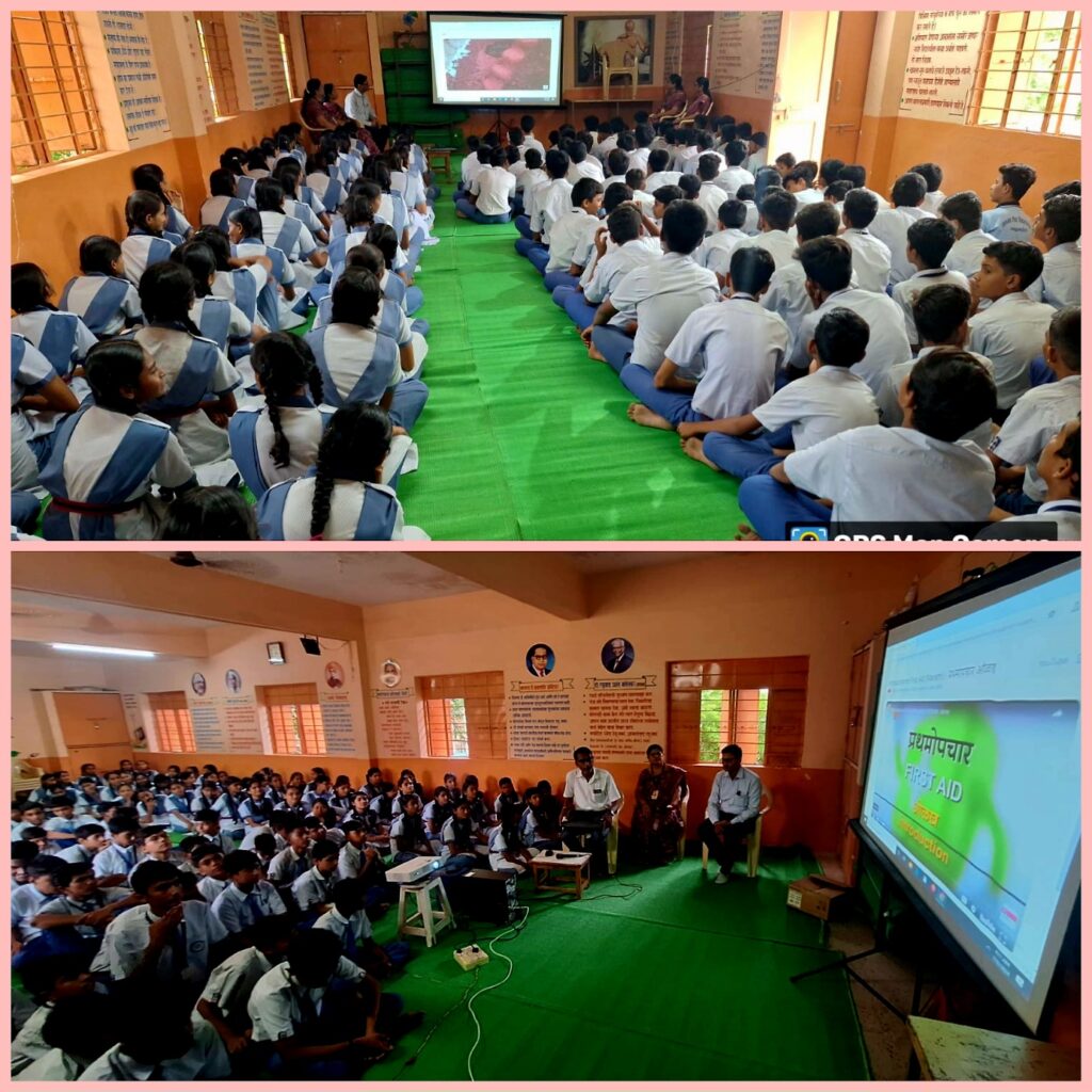 त्यानंतर LCD प्रोजेक्टरवर प्रथमोपचार व प्रथमोपचार पेटीतील साहित्य तसेच प्रथमोपचाराच्या वेळी घ्यावयाची काळजी याविषयी माहिती दाखविण्यात आली.