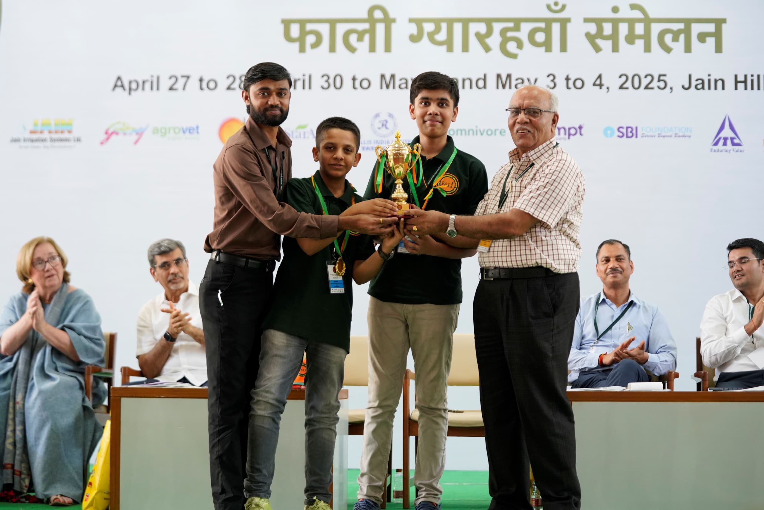 यावेळी व्यासपीठावर इनोव्हेशन व बिझनेस मॉडेल स्पर्धेतील परिक्षकांसह फालीच्या संचालिका नॅन्सी बॅरी, जैन इरिगेशनचे सहव्यवस्थापकीय संचालक अतुल जैन, ॲग्रीवाईज कंपनीचे सुरज पानपट्टे, युपीएलचे गणेश निकम, गोदरेज ॲग्रोवेटचे डॉ. रमेश पटाले, डॉ. विनोद चौधरी, अभिमुन्य ढोले, शैलेंद्र जाधव, अंकिता, दिवीसायी गौतम, प्रमोद उपाध्याय डॉ. गिरष गौतम-आयटीसी, अरूण श्रीमाली, नरेज पाटील- प्रोम्पट, मोहम्मद तौफीक, वैभव भगत-उज्जीवन, जैन इरिगेशनचे वरिष्ठ शास्त्रज्ञ डॉ. अनिल ढाके, किशोर रवाळे हे उपस्थित होते. मान्यवरांच्या हस्ते दोघंही स्पर्धेतील विजेत्यांना चषक, सन्मान चिन्ह देऊन गौरविण्यात आले.