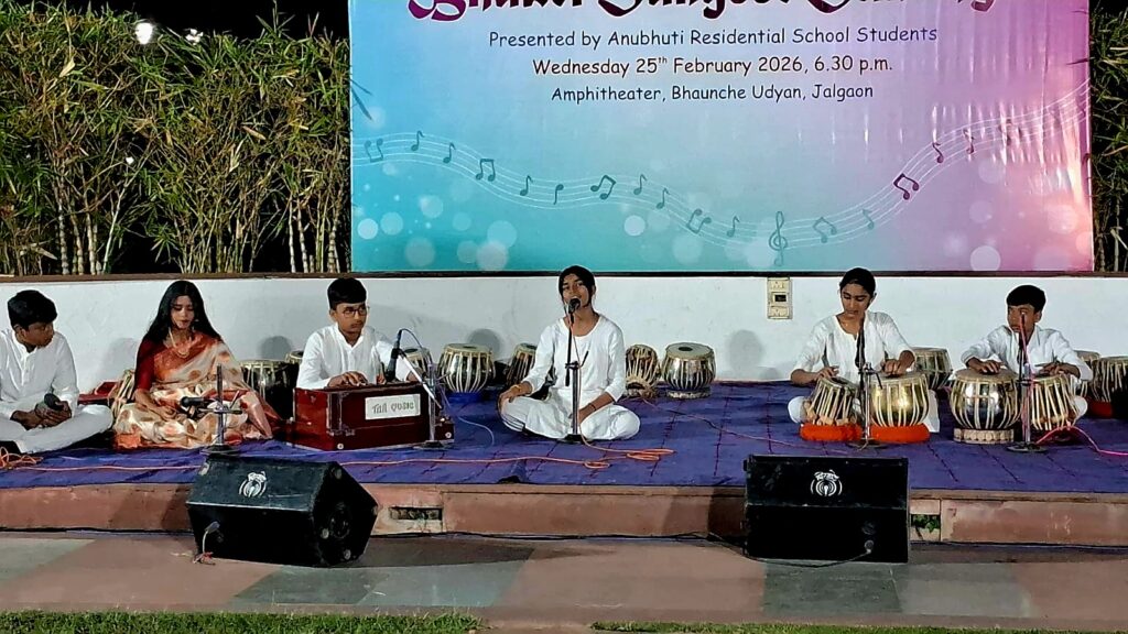 कार्यक्रमाची सुरूवात पांडुरंग नामी लागलासी ध्यास… या भक्तीगीताने झाली. देवा इंद्रायणी थांबला…, तुझ मे राम मुझ मे राम…मुझमे राम तुझमे राम सबमे राम समाये…, शोधिसी मानवा राउळी मंदिरी…, सुंदर ते ध्यान उभे विटेवरी…, माझे माहेर पंढरी… अशी एकापेक्षा एक सरस भक्तीगीते अनुभूती निवासी स्कूलच्या विद्यार्थ्यांनी आणि शिक्षकांनी सादर केली. या संगीत संध्येतून केवळ गायनच नव्हे, तर भावरलाल जैन यांच्या जीवनमूल्यांचा जागर करण्यात आला.